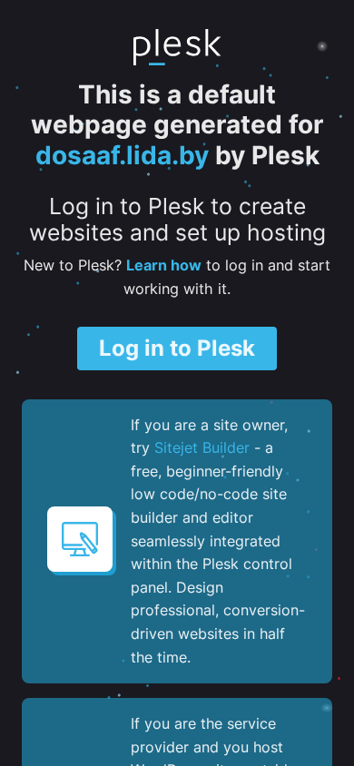 | AI-анализ | language: Belarusian type: corporate size: small The web project dosaaf.lida.by is a default page created for this .BY domain using the Plesk control panel. It contains information about the Plesk hosting platform, including its features, services and tools. Users can log into Plesk to create websites, manage hosting, and access additional features such as Sitejet Builder, a beginner-friendly site builder, and WP Guardian, a WordPress management tool. Plesk is a comprehensive hosting control panel designed for web professionals to manage web, DNS, mail and other services in a user-friendly way. The page also provides links to Plesk's online demo, guides, knowledge base, forum, developer blog, video guides, and Facebook page. |