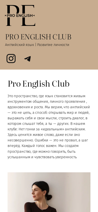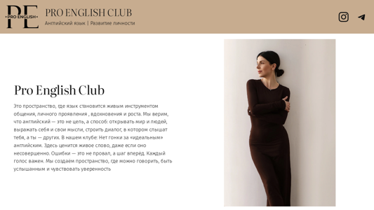 | AI-анализ | This website, titled "Pro English Club — Английский язык," is an English language learning platform. The description reveals that it is a space for making the language alive for communication, self-expression, inspiration, and growth. The club emphasizes that English is a tool, not an end goal, for opening up the world and people, expressing oneself and thoughts, and building dialogues. It offers services such as General English, Business English, and Easy Travel English, focusing on practical application and real-life situations. The club values living language, embracing imperfections and errors as learning opportunities. It aims to create a space where everyone's voice matters and individuals feel confident. The website provides online and offline learning formats, ensuring maximum interaction and engagement. |