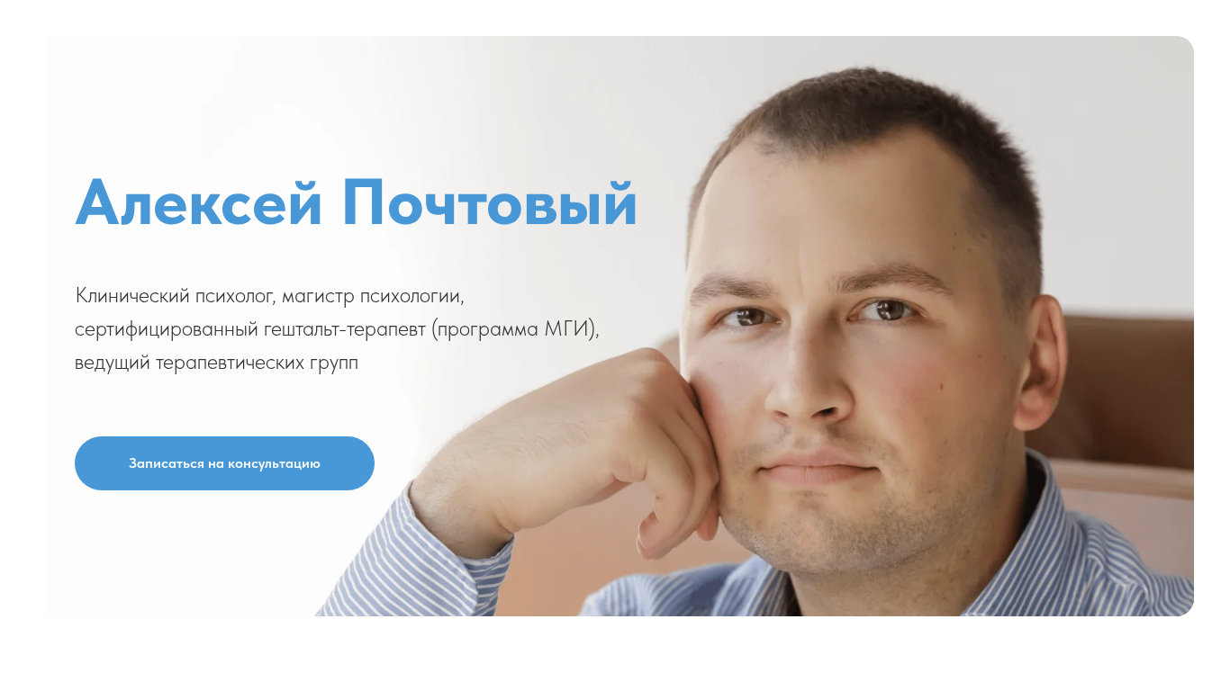 | AI-анализ | This online resource belongs to a clinical psychologist named Alexey Pochtovy, who holds a master's degree in psychology and is a certified Gestalt therapist. The website includes information about Alexey's therapeutic practice, which includes conducting individual consultations and leading therapeutic groups. The resource also states that Alexey began his journey in psychology in 2014 and has since accumulated personal experience that informs his professional work. He adheres to the ethical code of a Gestalt therapist and prioritizes continuous education, personal therapy, group supervision, and intervisitor groups with colleagues. The website lists various categories of requests that Alexey works with, including emotional and psychological states, personal development, relationships with others, traumatic experiences, behavioral and cognitive habits, career, money, social realization, and existential and philosophical questions. Visitors can request to discuss their specific concern through Tele |