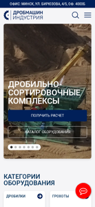 | AI-анализ | This website is the official online catalog of Drobmaschindustria, a Belarusian manufacturer and supplier of mining and construction equipment. The title is "Главная" (Home) and the description includes keywords like "оборудования" (equipment), "дробилки" (crushers), "грохоты" (screens), "производительность" (productivity), and "мощность" (power). The top words are "оборудования" (equipment), "дробилки" (crushers), "грохоты" (screens), "типа" (type), and "час" (hour). The catalog features various types of crushers (jaw, cone, hammer mill, rotary, roller, and laboratory crushers) and screens (inline vibrating, inclined vibrating |