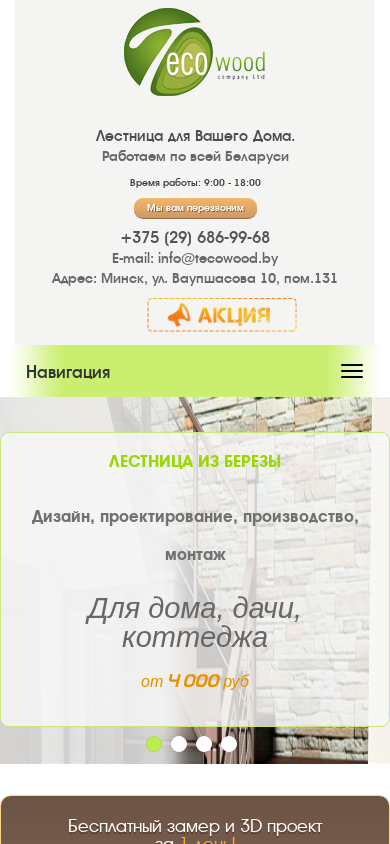 | AI-анализ | This website is for designing, manufacturing, and installing staircases for your home throughout Belarus. The company offers various types of staircases made from different materials such as birch, oak, and beech, with prices starting from 4,000 rubles for a basic model. The website provides information on the design, production, and installation process, as well as a catalog of available staircase models. Customers can request a free measurement and 3D project within one day. The company works throughout Belarus and offers a 24-month warranty with service support. Customers can choose the type and material of their staircase, including a concrete or metal foundation, and can select between straight, G-shaped, P-shaped, or spiral designs. The website also mentions the ability to create unique custom designs. The company's approach to manufacturing and installing staircases is professional, efficient |