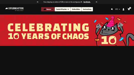 | AI-анализ | language: en The web project "Exploding Kittens" is an online shop specializing in party games, puzzles, and greeting cards. The site offers a variety of games including Exploding Kittens, Throw Throw Burrito, Bears vs Babies, You've Got Crabs, and many more. The keywords "games," "cards," and "puzzles" are frequently used, with "Exploding Kittens" and "cards" being the most prominent. The site also mentions "NSFW" games and greeting cards. The shop provides free shipping offers in the US, UK, and EU, with minimum order subtotals of $40, £33, and €40 respectively. The site is available in English and offers digital games and travel size games. The navigation includes collections, best sellers, on sale items, and various game and puzzle categories |