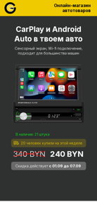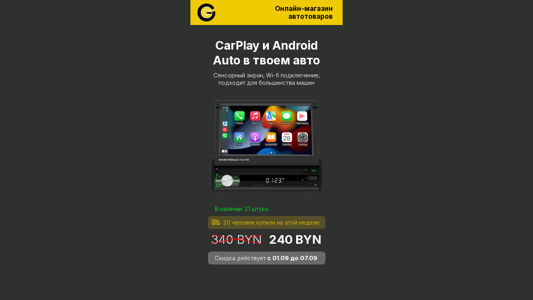 | AI-анализ | The portal is an online store for auto accessories. It offers CarPlay and Android Auto for various cars with a sensor screen and Wi-Fi connection. The store has 21 items in stock, priced between 240 and 340 BYN. This week, 20 people have made purchases. The sale runs from September 1 to September 7. The store provides instructions for installation and offers delivery throughout Belarus. The products are compatible with most cars and come with a one-year warranty. The online store offers a standard version with a manually extendable screen for 240 BYN and an upgraded version with automatic screen extension for 270 BYN. Customers can place an order by filling out a form and agreeing to the privacy policy. The store provides a 30% discount for those who place an order. |