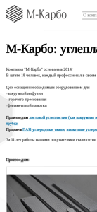 | AI-анализ | --- The web project "М-Карбо" is a website for a company specializing in the production and sale of carbon tubes and plates using the winding method, with a length of up to 700 cm. The company also sells carbon fabrics, fibers, carbon felt, and carbon paper. The team consists of 15 employees, and the production area is 1500 sq.m. The website includes information about various types and applications of the products, such as tubes for pipes, drones, velosiped frames, antenna masts, and vehicle suspensions. The company also offers flat carbon panels, cutting and milling of carbon, and carbon nonwoven fabric called "Бусофит". The website provides contact information for inquiries (info@m-carbo.ru). Keywords related to the business include "carbon tube", |