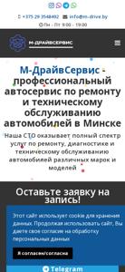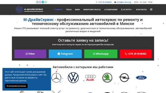 | AI-анализ | The web project "M-DriveService" is a professional automotive service company located in Minsk, Belarus. It offers repairs and technical maintenance for various automobile brands and models. Keywords associated with the website include "repair," "replacement," "systems," "diagnostics," and "professional." The company specializes in repairs of suspensions, braking systems, steering components, engine oil changes, computer diagnostics, engine repairs, and electrical system repairs. Additionally, they provide services for the repair and maintenance of BMW and Tesla vehicles. Contacts for the company include a phone number and email address. The business is open Monday through Friday from 9:00 AM to 7:00 PM. The website also mentions a new service for cleaning the intake manifold and exhaust gas recirculation system using Greek walnuts. The company guarantees its work |