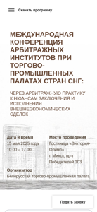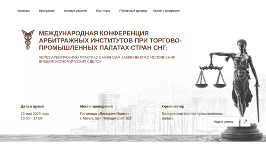 | AI-анализ | The website is for the International Arbitration Conference organized by the Belarusian Chamber of Commerce and Industry. Visitors can submit applications to attend the conference, ask questions, or download the program. The conference aims to provide recommendations to Belarusian businesses on errors to avoid when concluding, implementing, and enforcing foreign economic deals, as well as in dispute resolution. Recommendations will be given by experienced arbitrators from over 30 arbitral institutions. A business game is also featured, where international arbitration cases will be considered by an international arbitration panel. The conference takes place at the Victoria-Olymp Hotel in Minsk on May 15, 2025. |