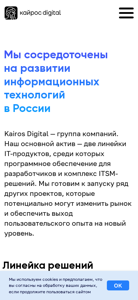 | SEO-описание | Kairos Digital сосредоточен на запуске проектов с высоким потенциалом развития. Нашими активами являются две линейки IT-продуктов, которые включают в себя ПО для разработчиков и ряд ITSM-решений для корпоративной автоматизации. |