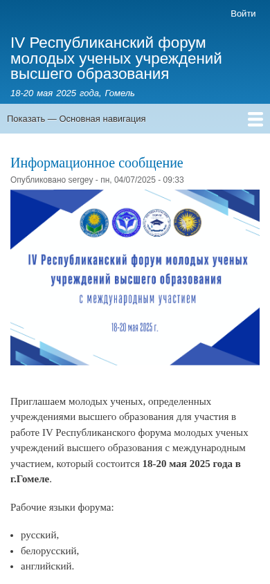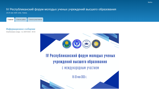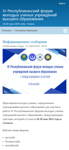 | AI-анализ | The website is for the IV Republican Forum of Young Scientists of Higher Education Institutions, which will take place from 18th to 20th May 2025 in the city of Homel, Belarus. The forum invites young scientists, defined by higher education institutions, to participate in discussions on various topics related to technology, economics, education, agriculture, and national security. The event will feature sections on current issues and future developments in technical, physical-mathematical, and natural sciences; contemporary economic development in the context of globalization and digitalization; challenges and prospects of education and human knowledge; fundamental and applied research in agriculture and veterinary science; and current questions related to national security in the Republic of Belarus. Participants can present their work through oral presentations or poster sessions. The site includes downloadable information about the program and subscription information. The site was created by Sergey B |