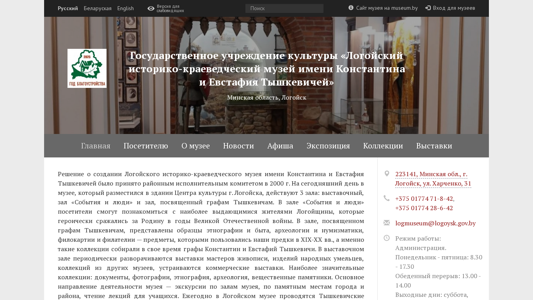 | AI-анализ | The portal Logoyskiy Historiko-Kraevedcheskiy Museum named after Konstantin and Evstafiya Tyskevichy is a cultural institution dedicated to news and event information, visitor details, pricing, exhibitions, collections, and resources for museum professionals. The museum, located in the Cultural Center of Lогойск, offers three main halls: a display hall, a hall for 'Events and People,' and a hall dedicated to the Tyskevichy family. The 'Events and People' hall introduces visitors to the most notable residents of Lогоyshchina who fought heroically for their homeland during the Great Patriotic War. The hall dedicated to the Tyskevichy family showcases ethnography, folklore, archaeology, numismatics, philately, and philately items from the 19th to 20 |