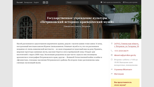 | SEO-описание | Государственное учреждение культуры «Петриковский историко-краеведческий музей» — новости и афиша мероприятий, информация для посетителей, цены, экспозиция, коллекции, материалы для музейщиков. |