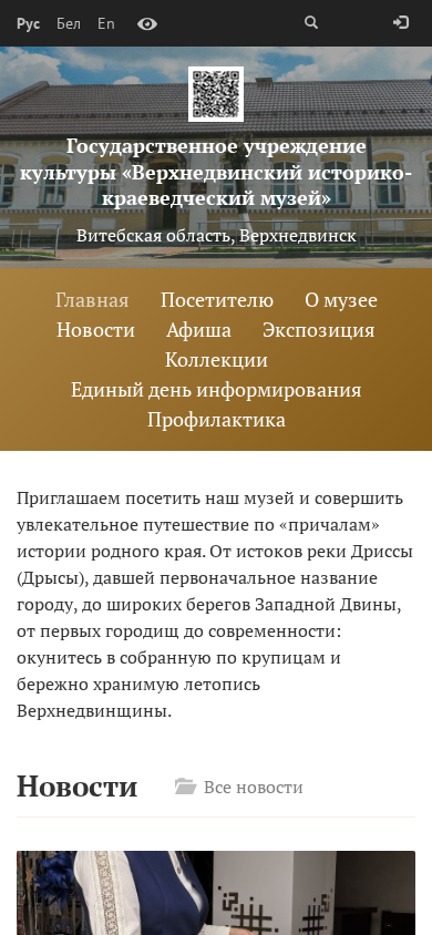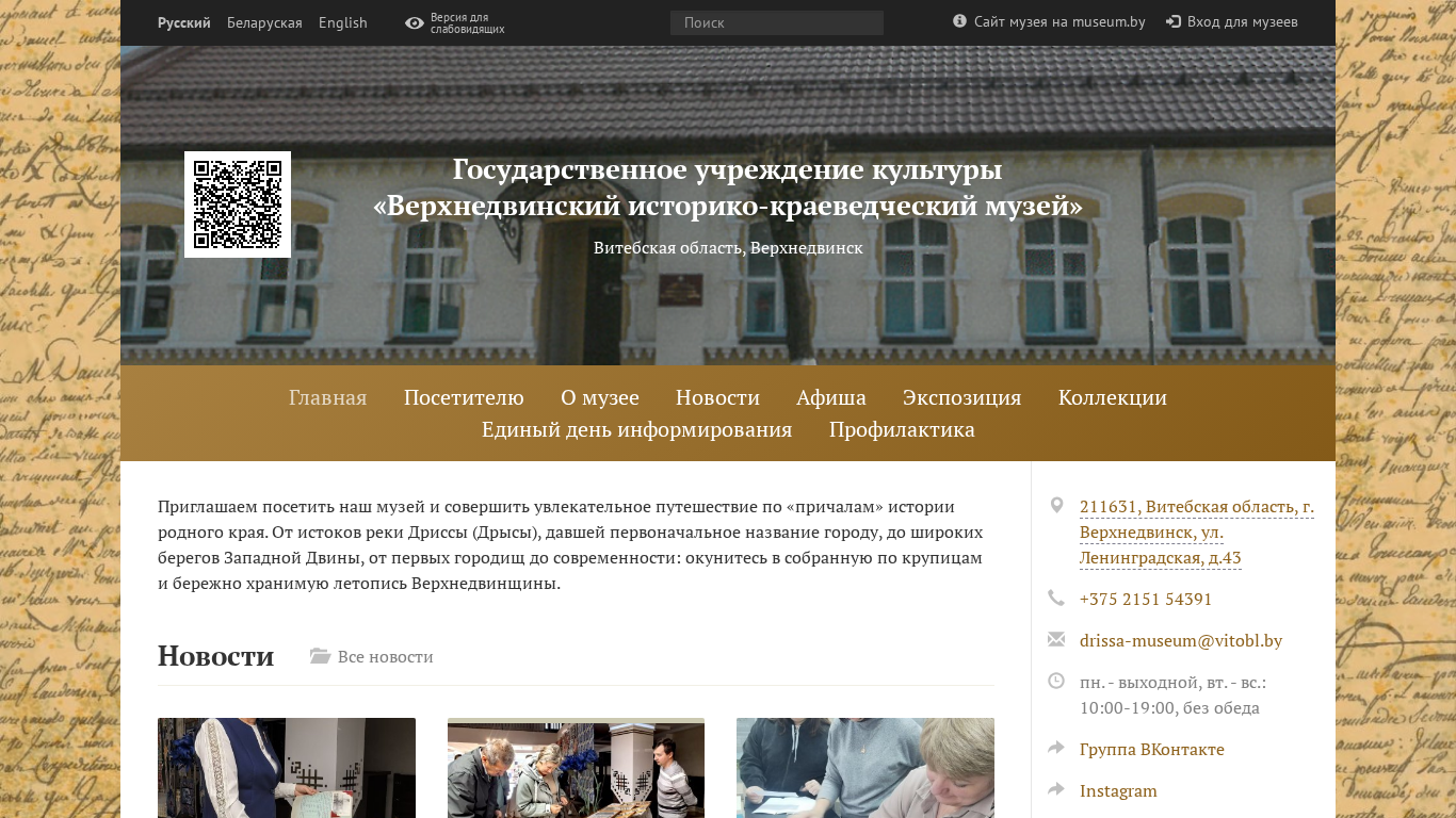 | SEO-описание | Государственное учреждение культуры «Верхнедвинский историко-краеведческий музей» — новости и афиша мероприятий, информация для посетителей, цены, экспозиция, коллекции, материалы для музейщиков. |