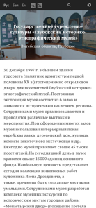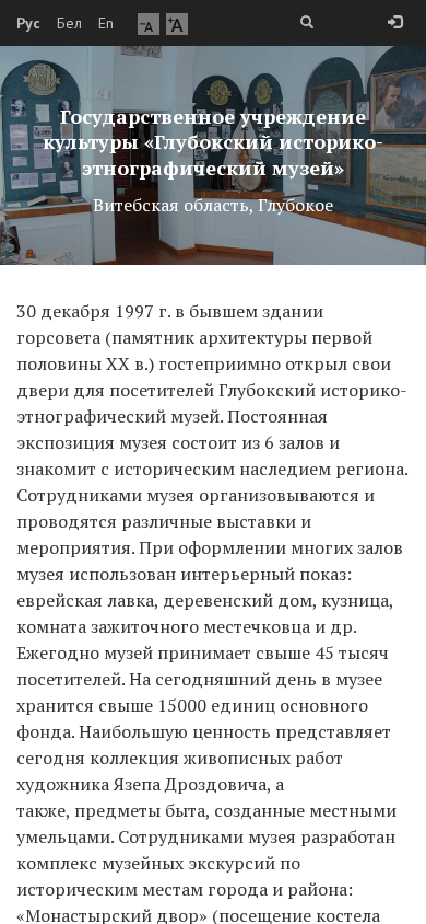 | SEO-описание | Государственное учреждение культуры «Глубокский историко-этнографический музей» — новости и афиша мероприятий, информация для посетителей, цены, экспозиция, коллекции, материалы для музейщиков. |