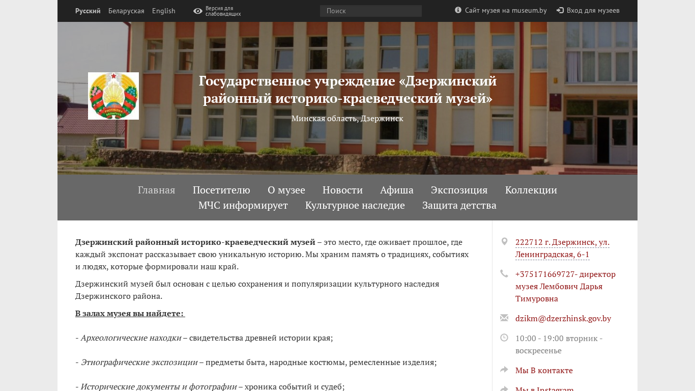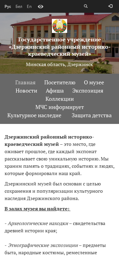 | SEO-описание | Государственное учреждение «Дзержинский районный историко-краеведческий музей» — новости и афиша мероприятий, информация для посетителей, цены, экспозиция, коллекции, материалы для музейщиков. |