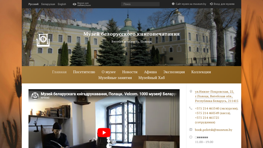 | AI-анализ | The web project "Museum of Belarusian Book Printing" is an informational website dedicated to the Museum of Belarusian Book Printing in Polotsk, Belarus. The site provides news, event schedules, visitor information, admission prices, exhibition details, collections, and resources for museum professionals. The museum focuses on the history of book printing in Belarus. Visitors can plan their visit through the "For Visitors" section and stay updated on museum events and news through the "News" and "Calendar" sections. The site also includes information on the museum's collections and educational programs. The contact information for booking tours, ticket sales, and inquiries to museum staff are provided. The site is available in Belarusian, Russian, and English languages. The domain name is book.polotsk.museum.by. |