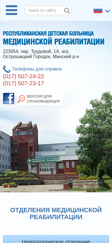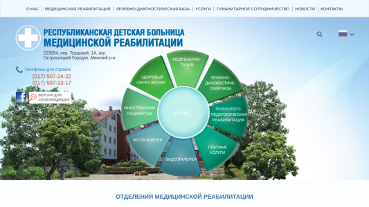 | AI-анализ | This website is for the Republic of Belarus Republican Children's Hospital of Medical Rehabilitation. It is a comprehensive medical institution equipped with modern facilities and comfortable conditions for the quick recovery of young patients. The website provides information on medical rehabilitation, diagnostic base, services, humanitarian cooperation, news, and contacts. The main sections include Medical Rehabilitation, Healthy Lifestyle, Diagnostic Base, Psychological-Pedagogical Rehabilitation, Paid Services, Video and Photo Galleries, and Services for Foreign Patients. The hospital offers various medical programs for rehabilitation after pneumonia or COVID-19, LIGHT, MEDIUM, SUPER, ANTISTRESS, and Mama and Ya, with durations ranging from 12 to 20 days. The pricing and payment details are also available on the website for both Belarusian and foreign citizens. |