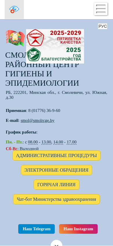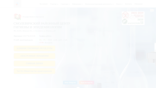 | AI-анализ | The portal Smol-rcge.by is the official website of the Smolevich District Center for Hygiene and Epidemiology in Belarus. It provides information on the center's activities, structure, services, and regulations related to health, safety, and product certification. The portal includes sections on ideological work, history, staff, prevention of corruption, and various departments such as informational services, healthy lifestyle, and VIC-HIV information. It also features vacancies, news, and a hotline for inquiries. The website is divided into several sections, including information on the center's structure, its services for citizens and businesses, and its area of accreditation. The portal also offers uplifting content on healthy living, VIC-HIV information, and links to related resources. The website provides information on typical violations discovered during inspections and checklists for various services, |