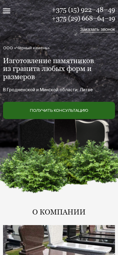 | AI-анализ | The website "Черный камень" (Black Stone) is a company based in Belarus that specializes in the production and installation of granite memorials, tombstones, and graveyards in the Grodno and Minsk regions, as well as in Lithuania. Established in 2006, the organization offers a range of services including the creation and artistic design of various granite monuments and memorials of all sizes and shapes. In addition, they fabricate and install other stone products such as countertops, tables, skirting boards, and fireplace details. The company's primary material is imported granite from a quarry in the Republic of Karelia. Their team consists of highly skilled and experienced workers, masters in stone cutting, shaping, and finishing. The production facilities use specialized equipment. The website provides images of their past projects and offers |