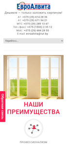 | AI-анализ | This online resource, titled "Europe Alvita – installation, dismantling, windows and doors in Oshmyany, Ostrovets, Smorgon and Ivye," is a website dedicated to offering windows and door services in certain Belarusian cities. The company, EuroAlvita, specializes in PVC window and door production. The website provides information on various window and door types, such as mansard windows, and lists prices for doors and windows. The top keywords on the site include "pvc," "windows," "375," "EuropeAlvita," and "doors." The site features a contact section with multiple phone numbers, an email address, and a link to a reverse call function. The homepage includes sections for "Our advantages," "Services," and "Calculator." The benefits listed are professionalism and a knowledgeable office staff, in-house production of |