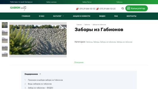 | AI-анализ | --- This website, titled "Gabioncity" and described as "Buying gabion stone fences in Minsk | Gabioncity," offers reliable gabion stone fences with a potential lifespan of up to 100 years. The installation process does not require welding and can be done on any terrain and at any time of the year. The website provides a catalog of various products, including fences, gates, and stones, with detailed descriptions and options to calculate costs and contact information. The website offers consultations and special offers. The main categories are fences, gates, and gabions, with subcategories for various types and applications. The website also includes a FAQ section and videos. The content is primarily in Russian, with some English words. |