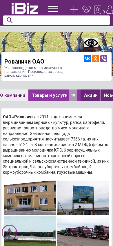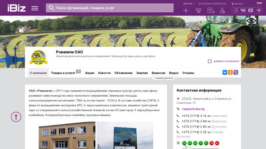 | Название / Заголовок | Рованичи ОАО - Животноводство мясо-молочного направления. Производство зерна, рапса, картофеля.. 223223, , Рованичи аг., Советская, 19 |