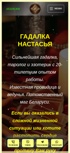 | AI-анализ | The portal gadalkaminsk.by is a website for a fortune teller in Minsk, Belarus named Nastasia. The description states that she is the strongest fortune teller in Minsk and offers over 60 different rituals using only white magic. She provides personal consultations and remote services. The site includes sections for testimonials, contacts, and services, and offers consultations via phone, Viber, Telegram, and WhatsApp. Nastasia, who has a 20-year experience, is a descendant of fortune tellers and inherited various knowledge, information, charms, and magical rituals from her family. She only performs actions on proven magic, ensuring no harm or sin. Nastasia claims to have helped hundreds of people in Belarus with various problems and has many repeat clients. Services offered include tarot card readings, help in returning a |