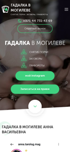 | AI-анализ | The website is a fortune-telling service operated by Anna Vasilievna, a psychic from Mogilev, Belarus. The site offers various forms of divination and magic, including palm reading, tarot cards, and more. Anna Vasilievna's abilities are described as genuine and effective. She provides services remotely and guarantees results, regardless of location. The site lists several services including love magic, protection, and business magic. There is also a section for booking an appointment and contact information for a return call. The website includes a video message from Anna Vasilievna. The services offered include various forms of divination, love magic, protection, and business magic. Anna Vasilievna claims to have a broad range of psychic abilities and can help with various personal and professional issues. The website provides a contact form for booking an appointment and a phone number for a return call. |
