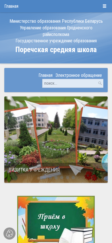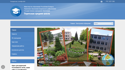 | AI-анализ | --- The website belongs to the 'Поречская средняя школа' (Porechskaya Srednyaya Shkola) in the Grodno region of Belarus. The title of the website is 'Поречская средняя школа' (Porechskaya Srednyaya Shkola), and it is run by the Ministry of Education of the Republic of Belarus. The website provides information about the school, including news, events, and educational programs. Key topics include the 80th anniversary of Victory in the Great Patriotic War, the reception process for new students, sports events, and educational initiatives. The website also includes a section for the 'Рейтинговой оценки качества оказания услуг и административных процедур организацией' (Rating Evaluation of the Quality of Service and Administrative Pro |