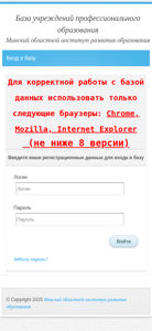 | AI-анализ | This online resource is titled "Учреждения ПТО и ССО" (Institutions of PTO and SSO in English) and provides a database of professional education institutions in Minsk region. The description includes the keywords "образования" (education), "минский" (Minsk), "областной" (regional), "институт" (institute), "развития" (development), "базу" (base), "пароль" (password), "учреждения" (institutions), "пто" (pre-vocational training organizations), "ссо" (vocational schools), "база" (base), "учреждений" (institutions), "профессионального" (professional), "вход" (entry), "корректной" (correct |