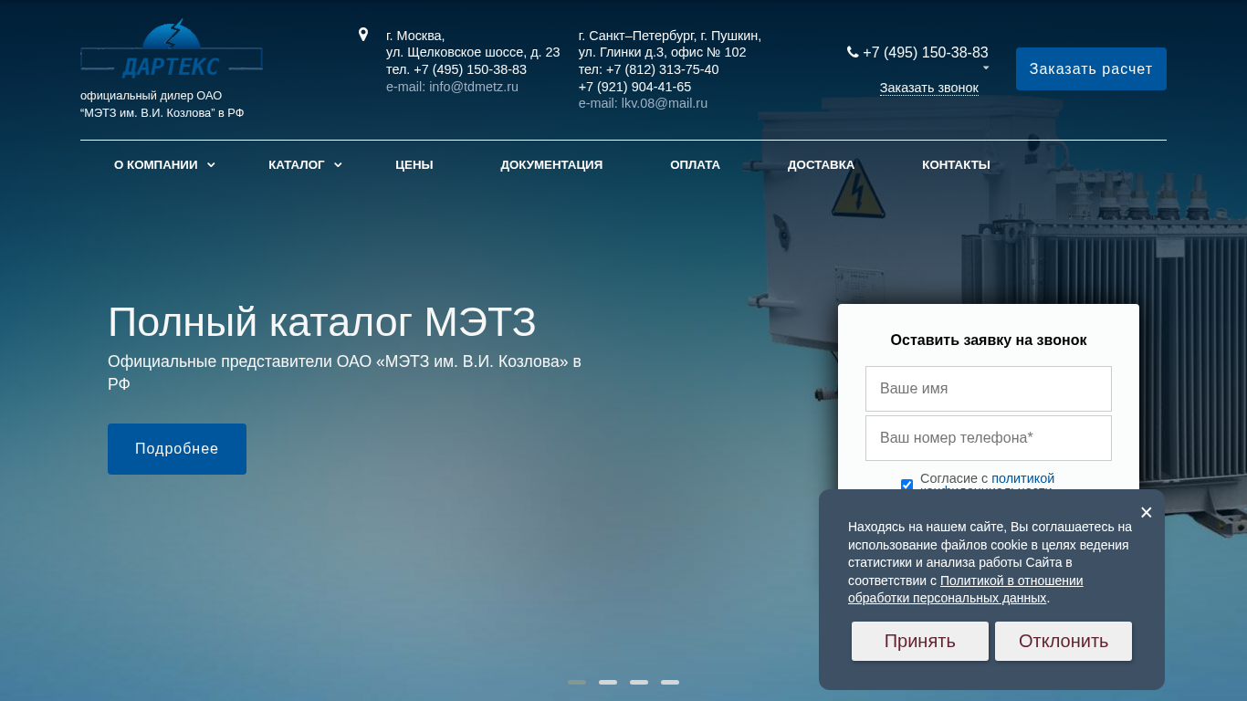 | AI-анализ | --- The website is an e-commerce platform for the sale of transformers and transformer stations in Moscow, Russia. It is the official dealer of OAO “МЭТЗ им. В.И. Козлова,” offering transformers at factory prices. The website provides contacts for purchasing in Moscow, St. Petersburg, and their respective phone numbers and email addresses. The products offered include various types and sizes of transformers, ranging from TMG-16 to TMG-33 series, as well as transformer stations and specialized transformers. The website also features information on certificates, documentation, pricing, and delivery, as well as options to request a call or leave a request for more information. The full catalog of METZ is available on the site, and daily updates on the availability of equipment at OOO "Dartex" are provided. |
