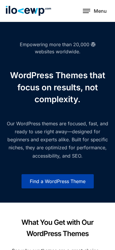 | AI-анализ | The web project "Ilovewp.com" offers a range of free and premium WordPress themes targeted towards various niches including businesses, blogs, podcasts, photographers, churches, hotels, museums, and educational institutions. The themes are designed to cater to both beginners and professionals, with a focus on simplicity, performance, accessibility, and search engine optimization. The website provides a quick start and simple setup, with one-click automatic updates, personalized support, and translation and multilanguage capabilities. The themes are built for speed and SEO, ensuring fast load times, higher search engine rankings, and improved user engagement. |