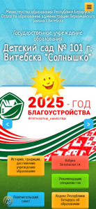 | AI-анализ | The website is for Kindergarten No. 101 in the city of Vitebsk, Belarus, named "Solnyshko" (Little Sun). The site provides information about the kindergarten's schedule, administration, admission procedures, forms, electronic applications, popular inquiries, contacts, and interactive maps of kindergartens in the First May District of Vitebsk. The kindergarten's goals, history, achievements, and educational programs are also featured. Users can learn about the kindergarten's management, pedagogical team, fee-based services, parent council, anti-corruption measures, photo gallery, license information, and support for families raising children with disabilities. The website includes sections on emergency response, social guarantees, early intervention centers in Vitebsk region, and prevention of violence and civil-patriotic education. Safety and security |