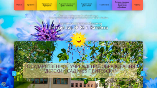 | AI-анализ | --- This website is for Kindergarten No. 85 in the city of Vitebsk, Belarus. The title is "Детский сад № 85 г. Витебска" and it provides information about the kindergarten's registration, administration, conditions for admission, and educational procedures. Keywords associated with the site include "Витебска" (Vitebsk), "детский сад" (kindergarten), "образования" (education), and "первомайского района" (First May District). The site also features interactive maps displaying availability of spaces in kindergartens, contact information for the kindergarten's pedagogical staff, and a page on social support and psychological assistance for students. Additionally, there is a section on the kindergarten's licensing and labor protection information for parents. The |