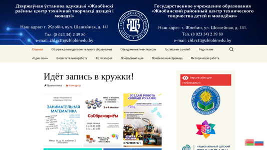 | AI-анализ | This online resource is the official website of the "Жлобинский районный центр технического творчества детей и молодежи" (Texni4es), a state educational organization based in Belarus. The website provides information about the center's activities in various fields, including technical, sports-technical, and IT. The homepage displays a menu with sections on the organization's background, administration, contacts, and various programs and initiatives. The website contains news and announcements, such as the registration for enrollment in classes starting in September 2025, and information on upcoming events, including the "Единый день информирования" (Single Day of Information) on September 19, 2025, and the "Мы вместе. Инициативы, улучшающие жизнь" (We Are |