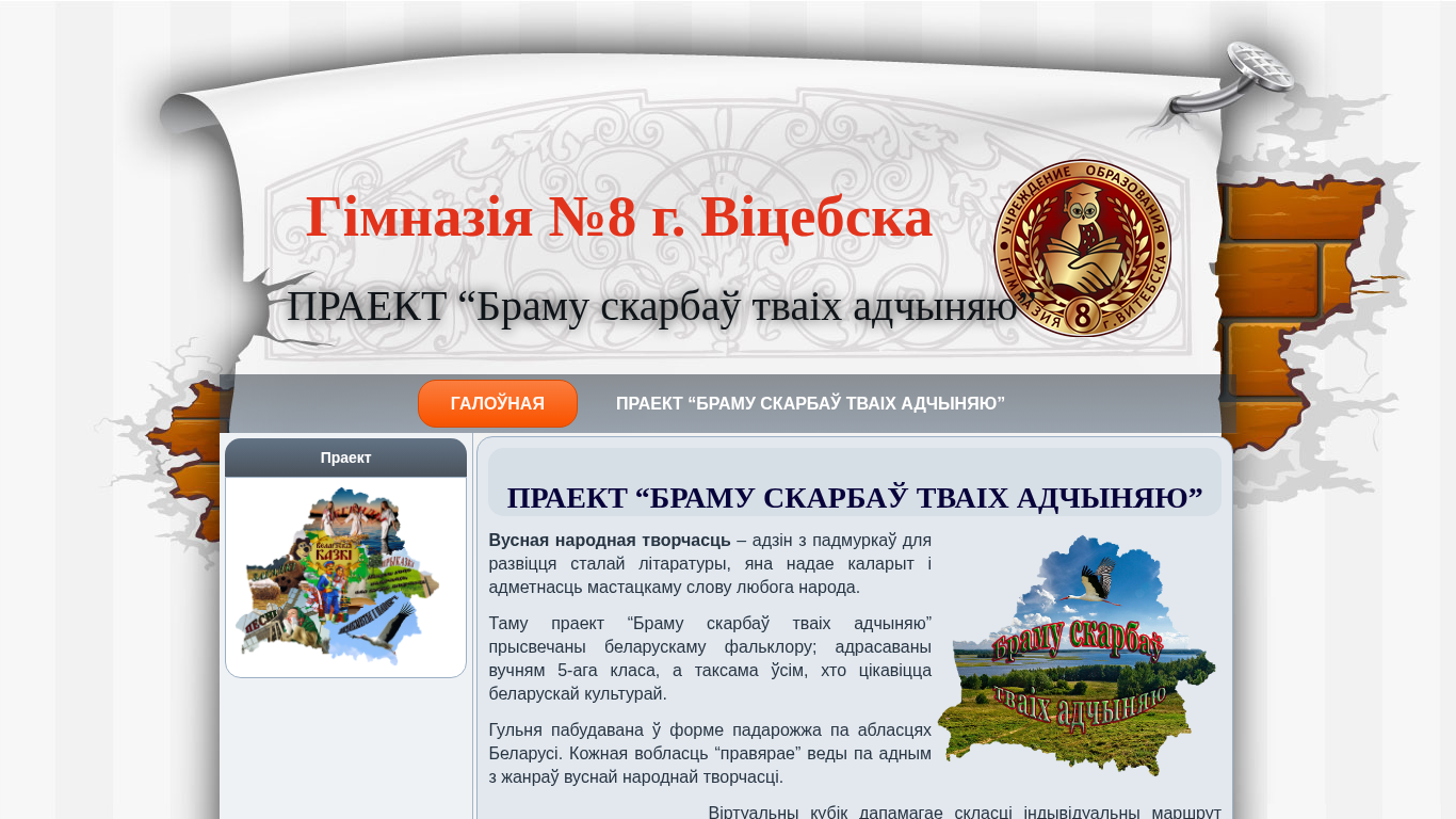 | AI-анализ | The website "Galounaya" is a literary newspaper of Gymnasium No. 8 in Viciebsk, Belarus. The project "Bramu skarbaў tvaich adchynyau" (Open the door to your treasures) is dedicated to Belarusian folklore and is designed for students of the 5th grade and anyone interested in Belarusian culture. The website is structured as a journey through the regions of Belarus. Each region "praviarae" (leads) in one type of Belarusian folk art. The virtual cube helps compile an individual route of exploration. Characters Yan and Yanek serve as knowledgeable guides and quizzy Cossack personages. Upon clicking the cube, a random region is selected. Before completing a task, it is necessary to determine which genre the region represents. For example, in |