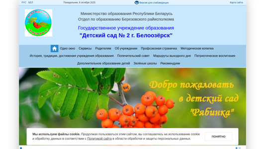 | AI-анализ | The portal ds2-blz.bereza.edu.by is a Belarusian educational institution website for kindergarten number 2 in the city of Beloozersk. It contains news, information about the kindergarten, and contacts. The website uses cookies and requires agreement to its data handling policy. The language options are Belarusian and Russian. The top words include 'Beloozersk', 'kindergarten number 2', 'news', and 'contacts'. Keywords are 'kindergarten', 'Beloozersk', 'news', 'contacts', and 'educational institution'. |