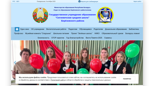 | AI-анализ | This website is the official page for Signevich Middle School, a state educational institution in Belarus. The title of the site is "Сигневичская средняя школа" (Signevichskaya Srednyaya Shkola) in Belarusian. The description section includes information about using cookies and the site's accessibility settings for users with visual impairments. The top keywords relate to the year 2025, reading, further information, education, help, safety, the school's location in Berozovsky rayon, and various administrative procedures. The site provides information about the school's leadership, educational programs, and policies, including a focus on anti-corruption measures and student support services. The domain name is signevichi.bereza.edu.by. |