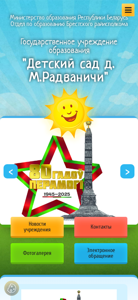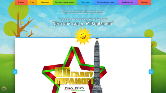 | AI-анализ | --- This online resource is a website for a kindergarten located in M. Radvanichi, Belarus. The title of the website is "Детский сад д. М.Радваничи" (Kindergarten of M. Radvanichi). The description includes information about the kindergarten's history, traditions, achievements, and special license. The website provides details about the admission process, work schedule, and organizational structure of the kindergarten. It also features a photo gallery and news section, as well as information on educational programs, requirements, and services. The website is organized around various topics such as educational process, social-pedagogical activities, health, and safety. The kindergarten offers various educational services, including those for children and youth, and hosts events such as "БЕЗОПАСНОЕ ДЕТСТВО" (Safe |