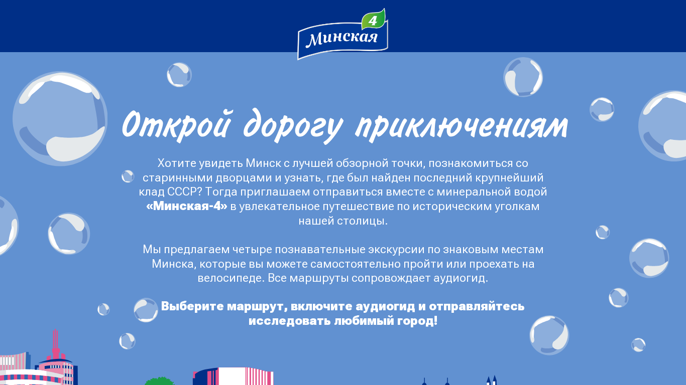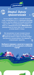 | AI-анализ | --- This online resource, titled "Открой дорогу приключениям" (Discover the Adventure Path), is a website dedicated to offering guided tours of historical sites in Minsk, Belarus. Visitors can explore the city independently or accompanied by an audio guide, choosing from four themed tours: 'Panorama of the Girl with the Owl' (featuring the National Opera and Ballet Theatre and the Market Square), 'Residence of the Chancellor' (exploring the city's history and hidden gems), 'Fire Department Depot' (focusing on architecture and local lore), and 'Island of Birds' (showcasing the city's natural beauty and cultural landmarks). The website is associated with the Mineral Water 'Minskaja-4', and features artwork by Belarusian artist and architect-designer Victoria Bogush, |