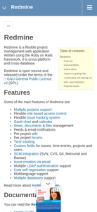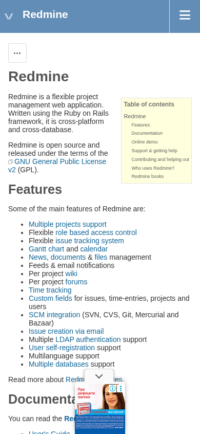 | AI-анализ | The website <http://redmine.org> is the official homepage of Redmine, an open-source project management web application. It provides information on Redmine features, documentation, downloads, and community resources. The site's title is "Redmine" and its description is "Redmine." The most common keywords associated with the site are "issue," "bug," and "tracker." The site includes sections for projects, help, search, and downloads, as well as resources such as user guides, developer guides, and a changelog. Redmine is a flexible project management application written using the Ruby on Rails framework and released under the GNU General Public License v2. Its main features include multiple projects support, flexible role-based access control, issue tracking, news and document management, and SCM integration. The site offers an online demo for users to try out the application's project administration features. |