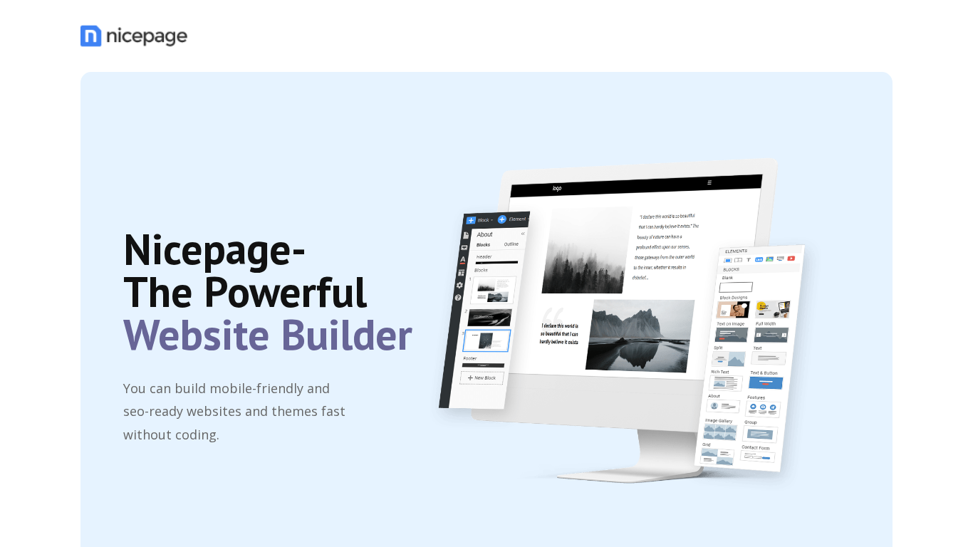 | SEO-описание | Get Nicepage to start making your great websites for free! Fully responsive. Without coding. Nicepage is available for Windows, Mac OS, WordPress, Joomla, and online. |