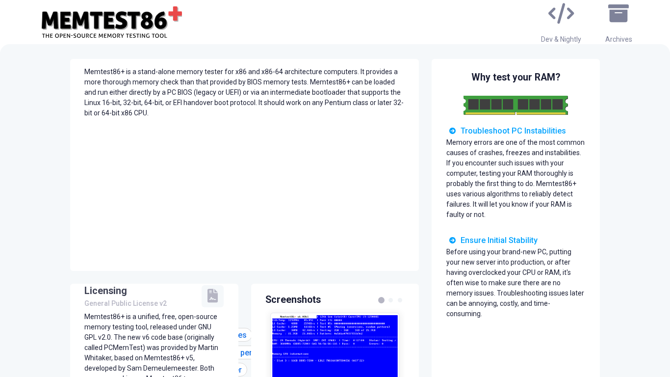 | SEO-описание | Memtest86+ is an advanced, free, open-source, stand-alone memory tester for 32- and 64-bits architecture computers. Compatible with BIOS & UEFI. |