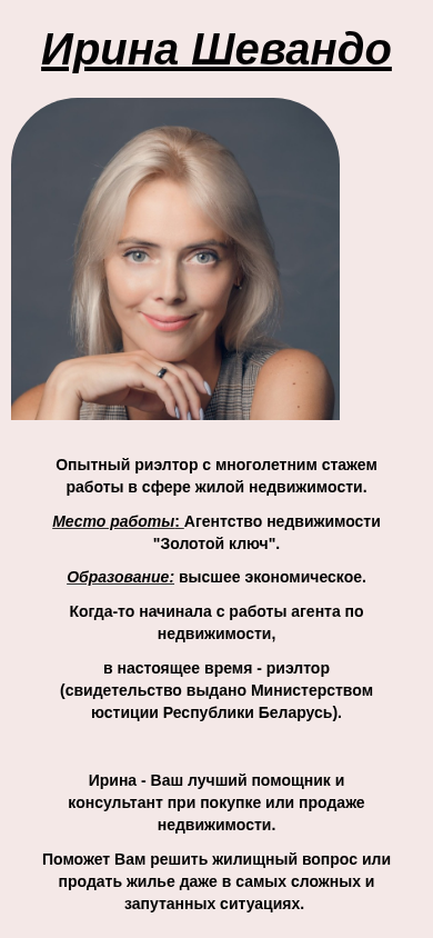 | AI-анализ | The portal irina001.by is a real estate agency website operated by experienced realtor Irina Shevando, who has a long history of working in the residential property sector. She is currently employed at the Golden Key Real Estate Agency. Irina holds a higher economic education degree and began her career as a real estate agent before becoming a realtor (licensed by the Ministry of Justice of the Republic of Belarus). Irina is your best assistant and consultant for purchasing or selling property, helping you resolve housing issues or sell real estate even in the most complicated situations. She can be reached at +375 29 313 18 97 (Viber, WhatsApp, Telegram) or via email at shevando.ira@gmail.com. The Golden Key Real Estate Agency is located in Minsk, Starynivskaya Street, |