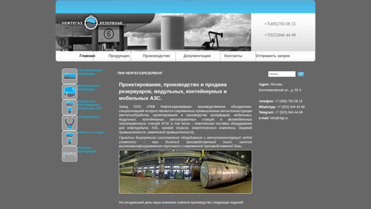 | AI-анализ | The website is a production enterprise, named "ПКФ Нефтегазрезервуар," specializing in modern industrial metal constructions, including the design, production, and sale of tanks and reservoirs for various industries, such as oil and gas, energy, food, and chemistry. The website offers both vertical and horizontal tanks, as well as modular, containerized, and mobile tanks for gas stations. The company's expertise includes the comprehensive supply of equipment for oil exploration, gas stations, oil and gas industries, energy sector, food industry, and chemical industry. The website provides guarantees for flawless production of equipment and metal constructions due to the company's rich production experience, highly qualified personnel, and advanced production facilities. The company's product range includes various sizes and types of steel tanks (vertical and horizontal), modular gas stations, containerized gas stations, mobile gas stations, and building metal structures ( |