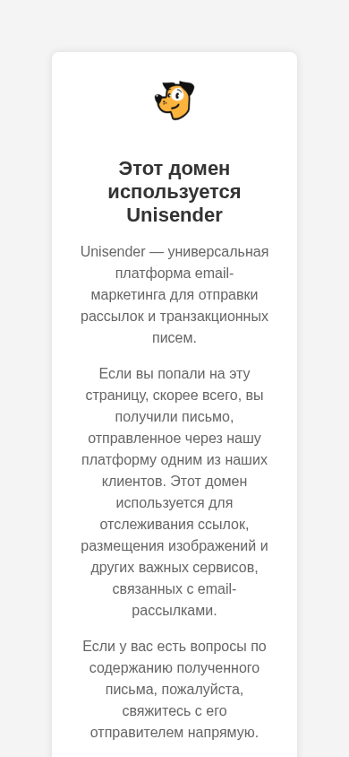 | AI-анализ | This online resource, titled "Unisender Tracking Domain," is associated with Unisender, a universal email marketing platform used for sending newsletters and transactional emails. If you have arrived at this page, it is likely that you have received an email sent through the Unisender platform from one of its clients. This domain is used for tracking links, image hosting, and other important services related to email marketing. If you have any questions about the content of the received email, please contact the sender directly. Unisender adheres to a strict anti-spam policy and does not tolerate spam. If you received unwanted email from one of its users and wish to complain or unsubscribe, appropriate actions will be taken, including removal of your email address from the mailing list and account verification of the sender. Unisender follows the best email marketing practices and abides by its: Privacy Policy | User Agreement | |