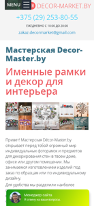 | AI-анализ | The web project Decor-Market.by specializes in custom photo frames and canvas prints for interior decoration. The title "Фоторамки на заказ и печать на холстах. Мастерская декора для вашего интерьера" reflects the focus on custom-made offerings for personalized home and office decoration. The website features various categories of frames and decor, including Dream Art Pop Art Flat, Love Is, and Module Compositions, among others. The site also provides restoration services for old photos. Users can place orders through the provided contact information, which is available on the website and through social media channels. Decor-Master.by is a sister company offering personalized nameplates and other decorative items. |