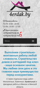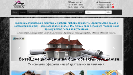 | AI-анализ | The web project "4erdak.by" is a construction company based in Minsk, Belarus, offering a range of building and installation services for both residential and commercial projects. The company specializes in various types of construction works including monolithic, masonry, and roofing projects. Their portfolio includes the construction of homes, cottages, and various structures such as verandas, porches, and fences. The company also provides repair and reconstruction services for existing buildings. The website features information on the types of services offered, pricing, and examples of completed projects. The company operates Monday through Friday, 8:00 AM to 8:00 PM and Saturday through Sunday, 10:00 AM to 5:00 PM. Contact information is provided for inquiries. |
