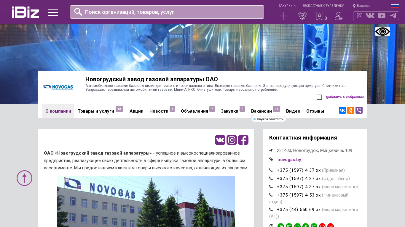 | AI-анализ | This website is for Novogrudsky Zavod Gasovoy Apparatury OAO, which specializes in producing and selling various types of gas equipment. The main product categories include automobile gas cylindrical and toroidal bottles, residential gas bottles, valve-reducing equipment, gas meters, mobile gas refueling station for automobiles, and fire extinguishers. The company is located in Novogrudk, Belarus, with the address given as Mikitevicha 109. |