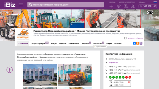 | Название / Заголовок | Ремавтодор Первомайского района г. Минска Государственное предприятие - Аренда дорожно-строительной техники: самосвала, седельного тягача, экскаватора, каналопромывочной машины, погрузчика, катка, автопогрузчика, трактора, фургона. Оказание платных автотранспортных услуг населению.. 220086, Минск, , Калиновского, 115 |