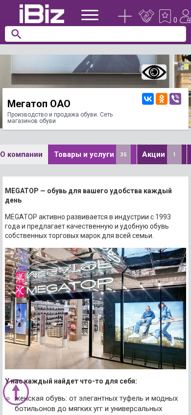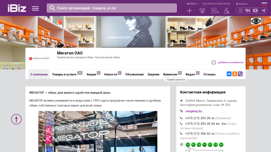 | AI-анализ | --- This online resource is dedicated to Megatop OAO, a company specializing in the production and sale of footwear. Megatop operates a network of footwear stores. The address of the headquarters is given as 220004, Minsk, Timiryazeva Street, house number 9, room number 224, in a multifunctional building. The website includes a map for navigation, contact telephone numbers, and the address of Megatop OAO. The company offers a range of footwear for various occasions, including women's shoes from elegant pumps to soft uggs and universal cross trainers; men's shoes with practical loafers for work, trekking boots for leisure activities, comfortable cross trainers and sandals for everyday life; and children's shoes with warm winter boots, light sandals, and cross trainers that provide |