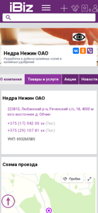 | AI-анализ | This website is for the Belarusian company "Nedra Nezhin OAO," which specializes in the development and extraction of potassium salts and potassium fertilizers. The site includes information about the company, its products and services, as well as contact details and a scheme for reaching the location. The company's Unified State Register number is 693260585. The site is located in the Luhansk region, Rechensky district, 18, 4000 meters south-east of d. Obchin, with contact numbers +375 (17) 942 00 xx and +375 (29) 107 81 xx. The company's opening hours are from 9:00 to 18:00, Monday to Friday, with |